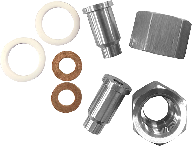 Ниппель, нерж. сталь – 2 шт. Накидная гайка, нерж. сталь – 2 шт. Медная прокладка 16,7×9×1,5 мм – 2 шт. Фторопластовая прокладка 24×18×2,5 мм – 2 шт. |
