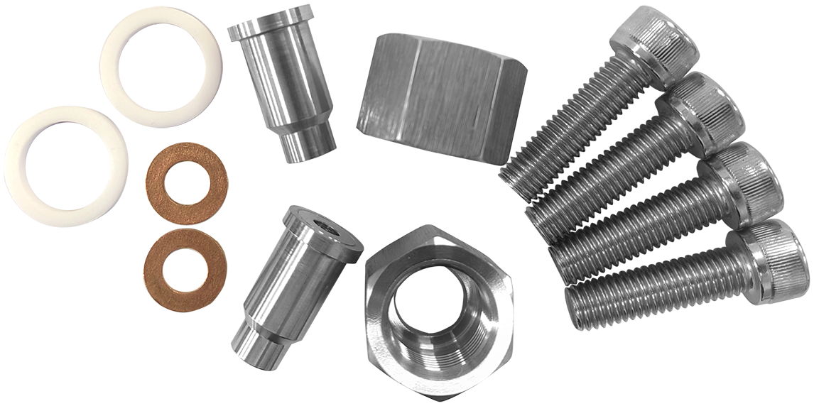Ниппель, нерж. сталь – 2 шт. Накидная гайка, нерж. сталь – 2 шт. Болт М10×35 DIN912 А2 – 4 шт. Медная прокладка 16,7×9×1,5 мм – 2 шт. Фторопластовая прокладка 24×18×2,5 мм – 2 шт. |