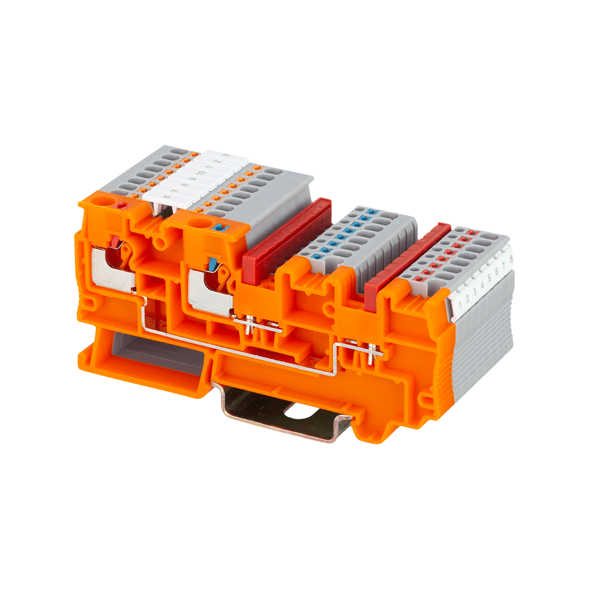 Клеммы MTP-IO1.5 с зажимами push-in предназначены для подключения датчиков и исполнительных устройств по трехпроводной схеме. Клемма имеет два изолированных разъема для подключения питающих проводников сечением 1,5 мм² и два проходных разъема для подключения сигнальных проводников сечением 1,5 мм².