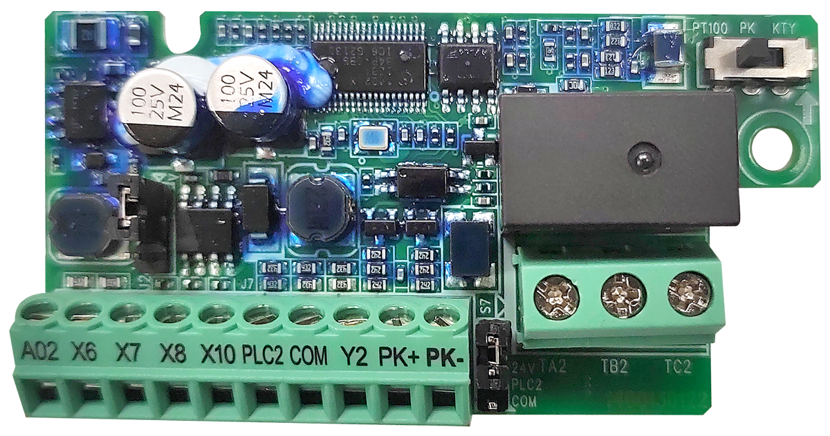 Плата ПВВ1 позволяет увеличить штатные входы/выходы ПЧВ на 1 аналоговый выход, 4 цифровых входа, 1 релейный выход, 1 цифровой выход, 1 вход датчика PT100/PT1000/KTY. Плата предназначена для работы с ПЧВ3 [M01].