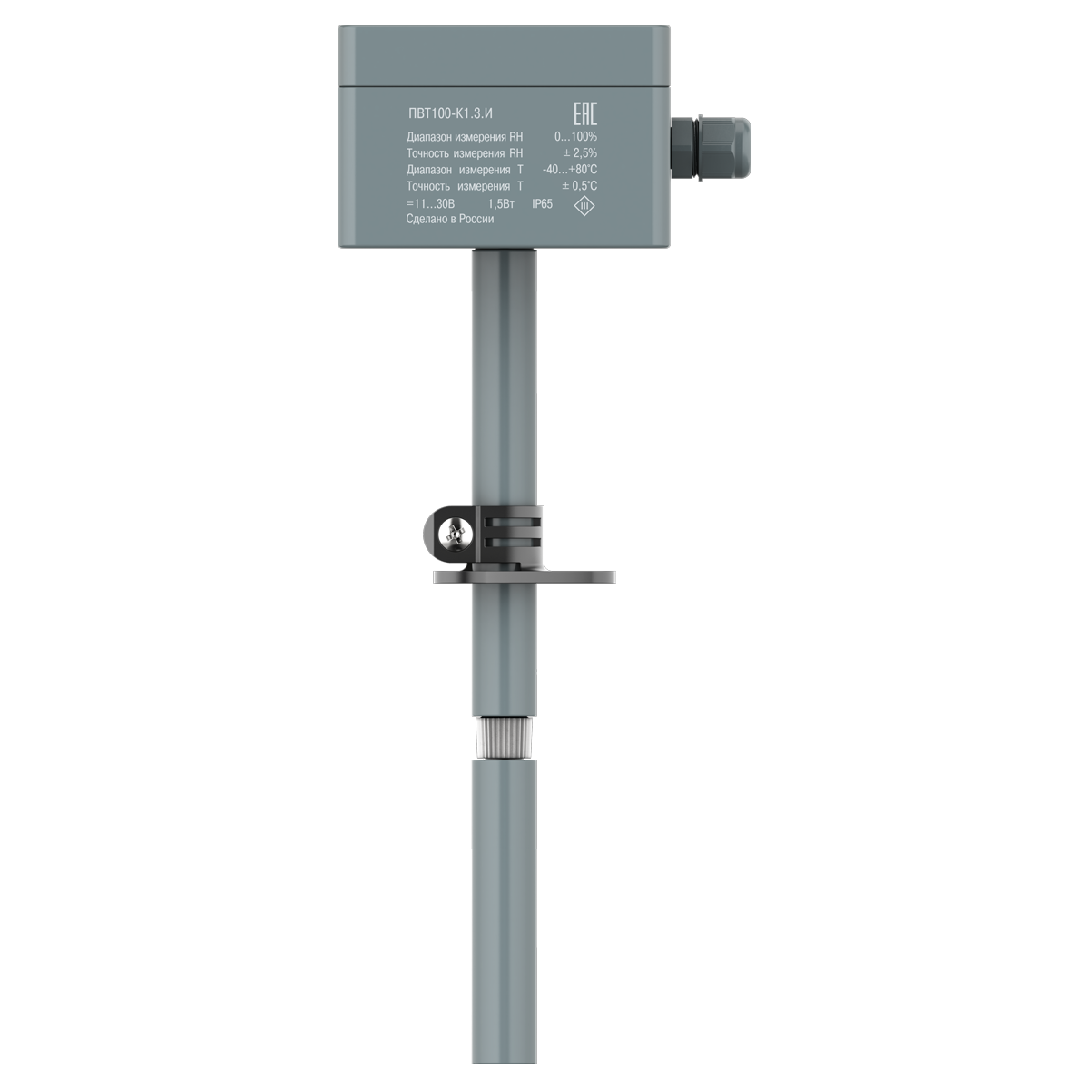 Модификация ПВТ100-К устанавливается в воздухопровод. Зонд помещается в измеряемую среду, а база датчика остается снаружи. Такой датчик может использоваться как в бытовой, так и в промышленной системе вентиляции и измеряет температуру от -40…+80 ⁰С и относительную влажность от 0…100 %RH. В комплект поставки канального датчика ПВТ100-К входит трехточечный фиксатор.